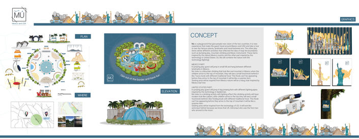 MU is a playground that combining the two countries United States and Mexico without any borders. Mu is part of Bridge community link between El Paso, Texas, USA and Ciudad Juarez, Chihuahua, Mexico. In the Rio Grande River (Rio Bosque Park. The bridge will have multiple activities that the guests can do from both of the countries such as (picnic area, Playing ground, Hiking, Food court). This bridge will be like small Plaza center that link the two countries.